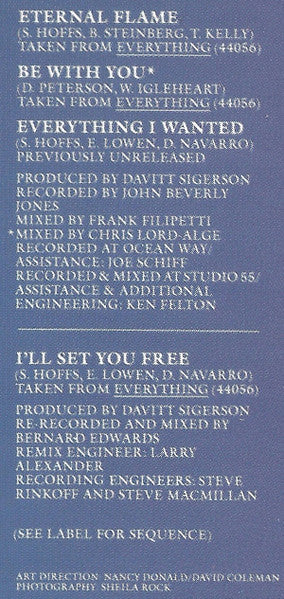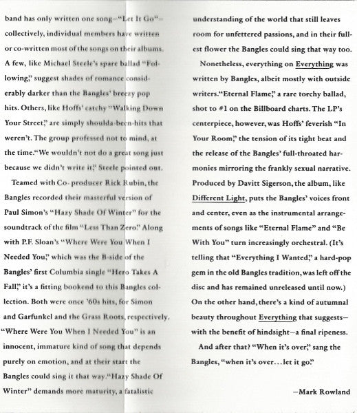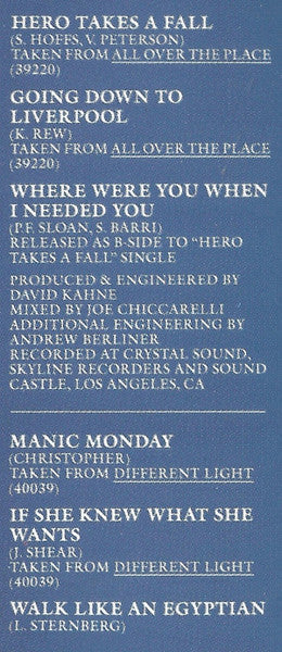 Tracklist: A1. Hero Takes A Fall, A2. Going Down To Liverpool, A3. Manic Monday, A4. If She Knew What She Wants, A5. Walk Like An Egyptian, A6. Walking Down Your Street, A7. Following, B1. Hazy Shade Of Winter (7" Version), B2. In Your Room, B3. Eternal Flame, B4. Be With You, B5. I'll Set You Free, B6. Everything I Wanted, B7. Where Were You When I Needed You