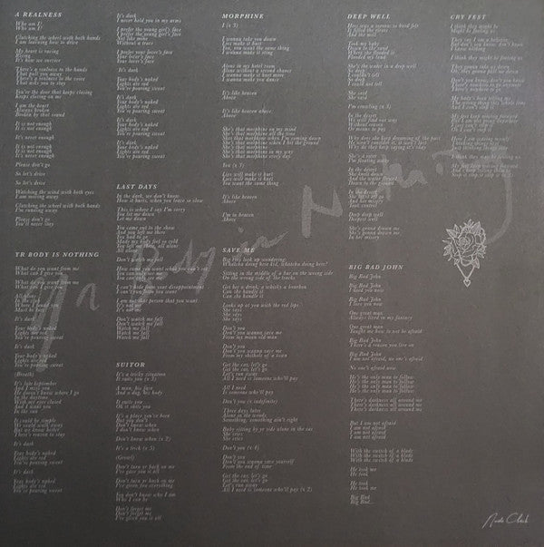 Tracklist: A1. Intro, A2. A Realness, A3. Yr Body Is Nothing, A4. Last Days, A5. Suitors, B1. Morphine, B2. Save Me, B3. Deep Well, B4. Big Bad John, B5. Cry Fest