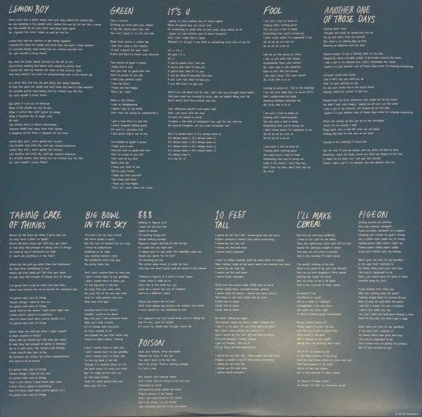 Tracklist: A1. Lemon Boy, A2. Green, A3. It's U, A4. Fool, A5. Another One of Those Days, B1. Taking Care of Things, B2. Big Bowl in the Sky, B3. 888, B4. Poison, B5. 10 Feet Tall, B6. I'll Make Cereal, B7. Pigeon