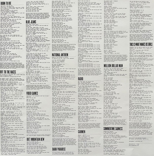 Tracklist: A1. Born To Die, A2. Off To The Races, A3. Blue Jeans, A4. Video Games, A5. Diet Mountain Dew, A6. National Anthem, B1. Dark Paradise, B2. Radio, B3. Carmen, B4. Million Dollar Man, B5. Summertime Sadness, B6. This Is What Makes Us Girls