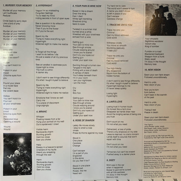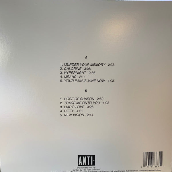 Tracklist: A1. Murder Your Memory, A2. Chlorine, A3. Hypernight, A4. Mrahc, A5. Your Pain Is Mine Now, B1. Rose Of Sharon, B2. Trace Me Onto You, B3. Liar's Love, B4. Dizzy, B5. New Vision