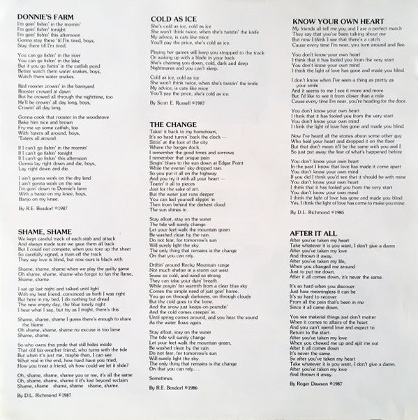 Tracklist: A1. Welcome, A2. Delta Cowboy, A3. Give My Heart, A4. Lonesome Boy, A5. Angel Of Purpose, B1. Donnie's Farm, B2. Shame, Shame, B3. Cold As Ice, B4. After It All, B5. Know Your Own Heart, B6. The Change