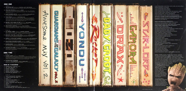 Tracklist: . Awesome Mix Vol. 2, A1. Mr. Blue Sky, A2. Fox On The Run, A3. Lake Shore Drive, A4. The Chain, A5. Bring It On Home To Me, A6. Southern Nights, B1. My Sweet Lord, B2. Brandy (You’re A Fine Girl), B3. Come A Little Bit Closer, B4. Wham Bam Shang-A-Lang, B5. Surrender, B6. Father And Son, C1. Flash Light, C2. Guardians Inferno, . Score, C3. Showtime, A-Holes, C4. Vs. The Abilisk, C5. Space Chase, C6. Family History, C7. Groot Expectations, C8. Mammalian Bodies, D1. Two-Time-Galaxy Savers, D2. I Know Who You Are, D3. Ego, D4. Kraglin And Drax, D5. The Expansion, D6. Mary Poppins And The Rat, D7. Gods, D8. Dad, D9. A Total Hasselhoff, D10. Guardians Of The Frickin’ Galaxy