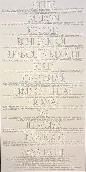 Tracklist: A1. 3 Sisters, A2. Evil Spawn, A3. Ice Cold, A4. Right Back To It, A5. Burns Out At Midnight, A6. Bored, B7. Lone Star Lake, B8. Crimes Of The Heart, B9. Crowbar, B10. 365, B11. The Wolves, B12. Tigers Blood
